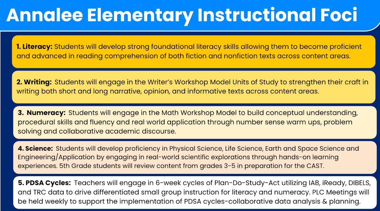 Annalee Elementary & STEAM Magnet School is a 2025 California Distinguished School located in Carson, CA. We achieved this honor through rigorous standards-based instructional practices, and the hard work of our teachers, students, staff, and the unwavering support of parents and caregivers. For the 2025-2026 school year, we will continue to prioritize instructional practices that have allowed us to consistently make academic gains. Please find below an overview of our 2025-2026 Instructional Priorities in the areas of Literacy, Writing, Numeracy, Science, and using student data to drive instruction through Plan Do Study Act (PDSA cycles). We look forward to partnering with our stakeholders to make 25-26 another year filled with learning and growth!